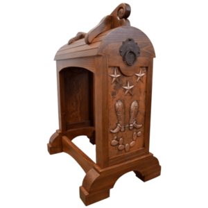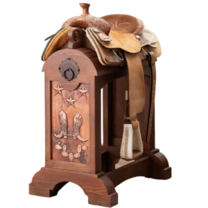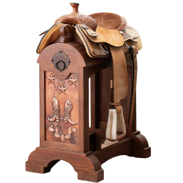 That’s why this saddle stand is far from ordinary. It’s a tribute to ranch life, designed for those who value every detail of the craft. Its solid wood construction stands the test of time, while the personalized copper plate makes each piece unique. Telling your story, your family’s name, or your ranch’s brand.