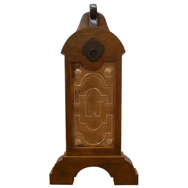 The Authentic Casero 01-29 Saddle Stand is a unique piece showcasing symmetrical tooled designs on its hand-hammered copper panel. The initials are centered in the panel, and each corner is adorned with a smaller copper concho, adding a touch of rustic elegance. Above the panel, a forged iron ring and plaque complete the sturdy, authentic design. Crafted from solid wood, each saddle stand is fully customizable, allowing you to personalize the ornamental copper design and finish to match your style. Ideal for those who love cowboy decor, this stand combines high-quality craftsmanship and custom options.