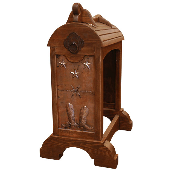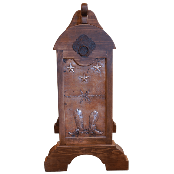 The Saddle Stand Casero Collection 0140 is a true tribute to rodeo culture, featuring intricate craftsmanship and western-inspired details. The hand-hammered copper panel at the front showcases a central, tooled barbed wire design, symbolizing the rugged spirit of the American West. Above the design, three tooled stars capture the essence of the Texas sky, while beneath the barbed wire are two tooled western boots, further emphasizing the rodeo theme.