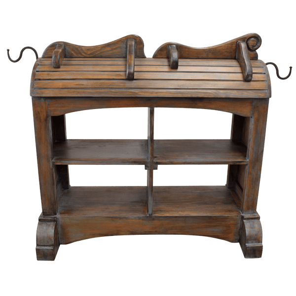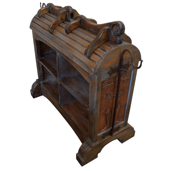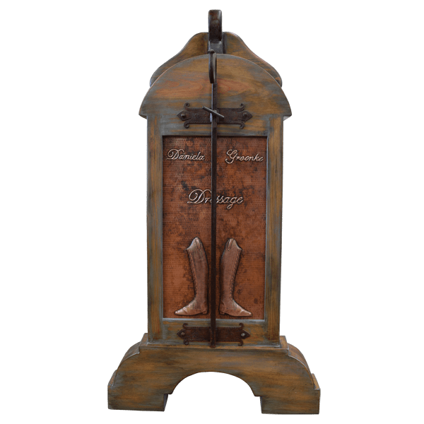 In the industry, the Jorge Kurczyn “Casero” saddle stand was the original saddle stand. While many copy our products, the best choice for displaying and caring for your saddle is the original. Your saddle stand may be adorned with a hand hammered copper panel, and the panel may be enriched with tooled western designs. It may also be personalized by including your tooled initials or ranch brand in the design. There are many existing copper designs to choose from, or we can work with you in creating your own design. The saddle stands are built to resemble a horse’s back. It does not matter how big your saddle is, it will sit perfectly on the saddle stand, and the saddle will not rollover. Built from solid timber, our saddle stands are 100% customizable and guaranteed for life.