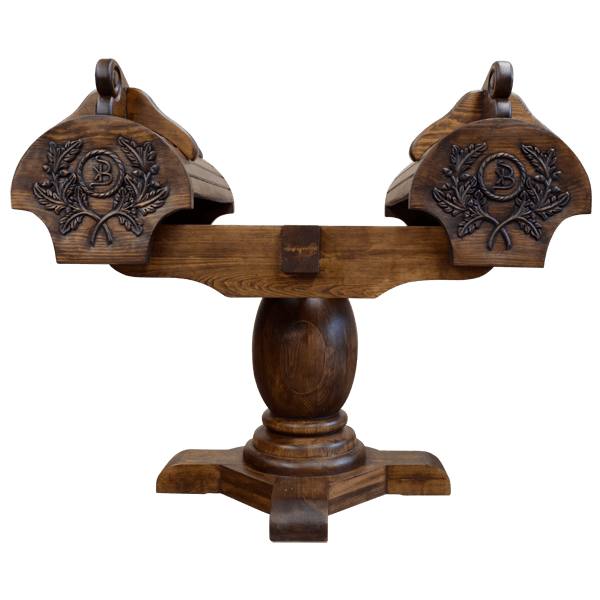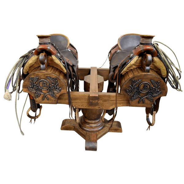 SHIPPING - USA & MEXICOThis spectacular, handcrafted saddle stand is built to display two saddles. The front of the twin stands feature exquisite, carved, foliate designs, each with a carved ranch brand in its center. A robust, solid wood, turned pedestal supports the saddle stand, and it rest on a sturdy platform with feet. The saddle stands are 100% customizable, including the finish and the copper design.