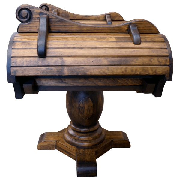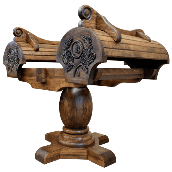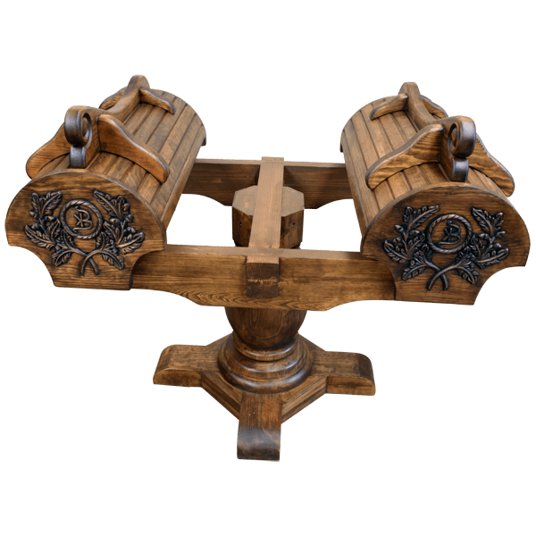 This spectacular, handcrafted saddle stand is built to display two saddles. The front of the twin stands feature exquisite, carved, foliate designs, each with a carved ranch brand in its center. A robust, solid wood, turned pedestal supports the saddle stand, and it rest on a sturdy platform with feet. The saddle stands are 100% customizable, including the finish and the copper design.