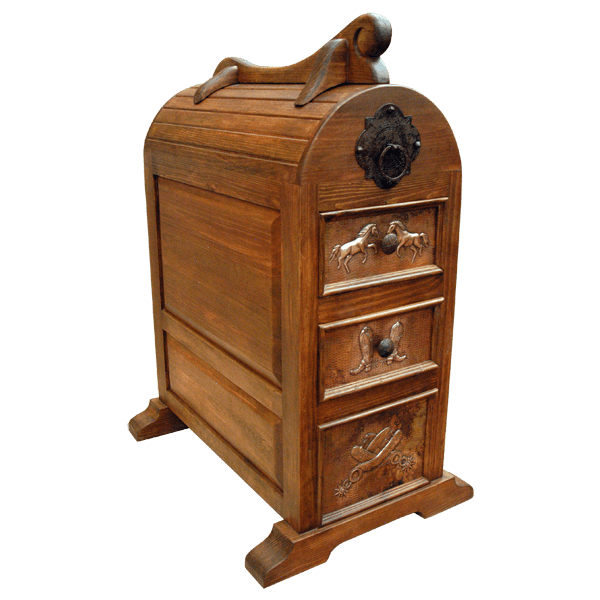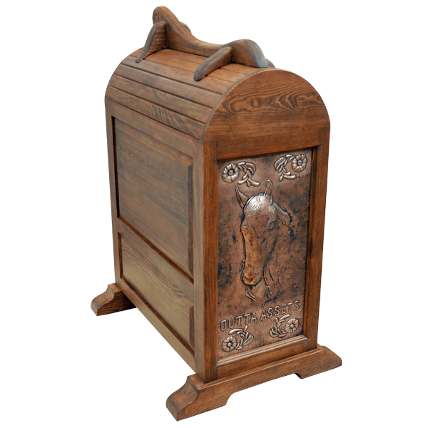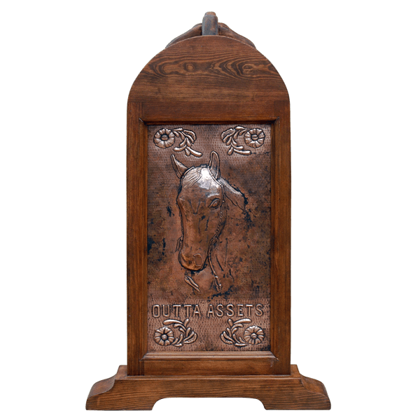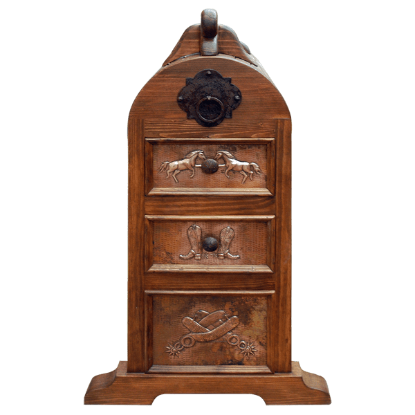 SHIPPING - USA & MEXICOThis handcrafted, Ponderosa saddle stand has a magnificent, reverse, copper panel, and the panel is embellished with a tooled horse´s head, with the horse´s name below. Each corner of the reverse panel is also enriched with tooled flowers. Two drawers enhance the front of the stand, and each drawer is covered with a hand hammered copper panel. The top drawer panel is enhanced with two, tooled, running horses, and the lower drawer panel features tooled western boots. Centered in each drawer is a forged iron ring. Below the two drawers is a rectangular copper panel, and the panel has detailed tooled spurs on its face. Our saddle stands are 100% customizable, including the copper design and the finish.