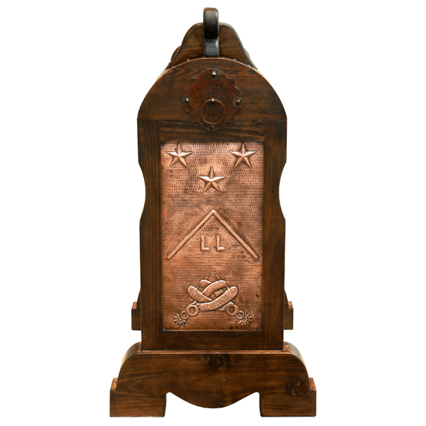 A tooled ranch brand with stars above and detailed tooled stirrups below enhance the hand hammered copper panel of this Rio Grande saddle stand. A forged iron ring and plaque embellishes the top of its solid wood frame. Our saddle stands are 100% customizable, including the copper design and the finish.