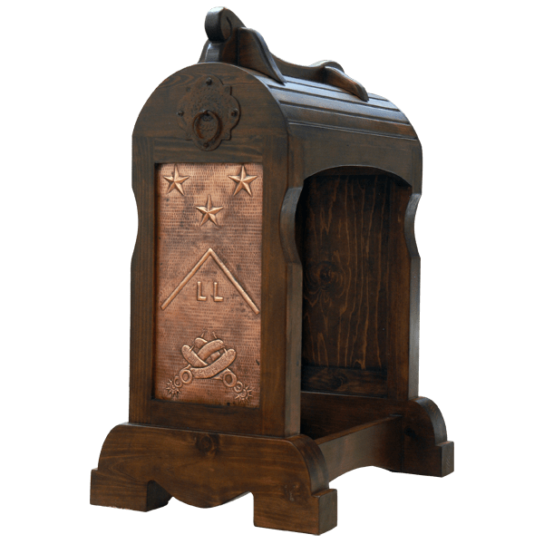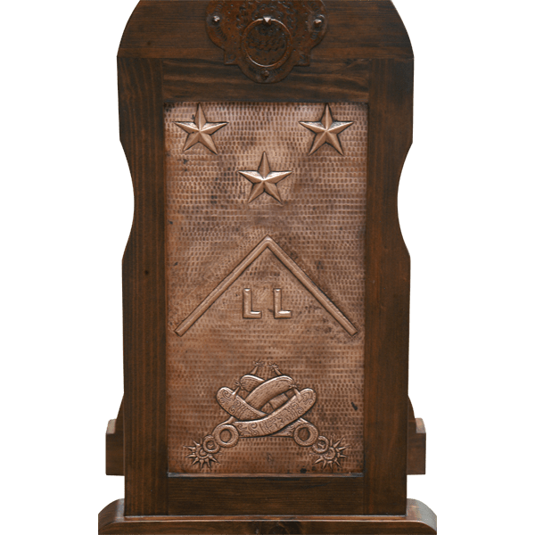 SHIPPING - USA & MEXICOA tooled ranch brand with stars above and detailed tooled stirrups below enhance the hand hammered copper panel of this Rio Grande saddle stand. A forged iron ring and plaque embellishes the top of its solid wood frame. Our saddle stands are 100% customizable, including the copper design and the finish.
